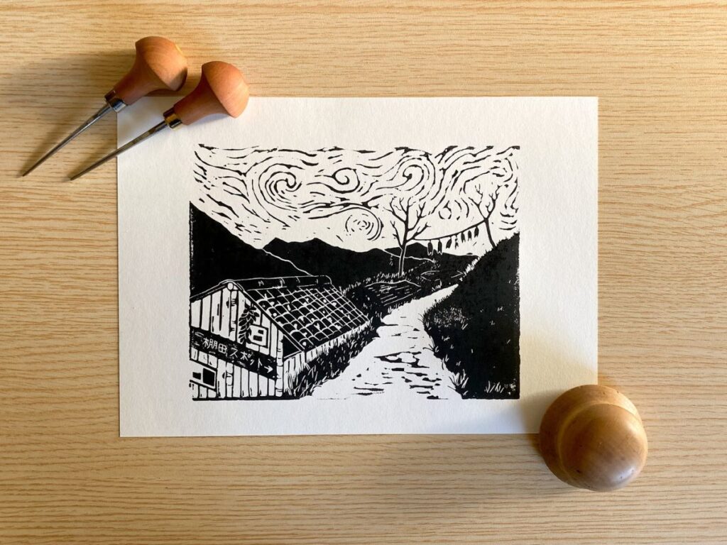 I entered this mini lino print in the Awagami Factory International Mini Print Exhibition held in Tokushima Prefecture. It’s a great exhibition displaying prints from across Japan and around the world and is usually held around October each year.