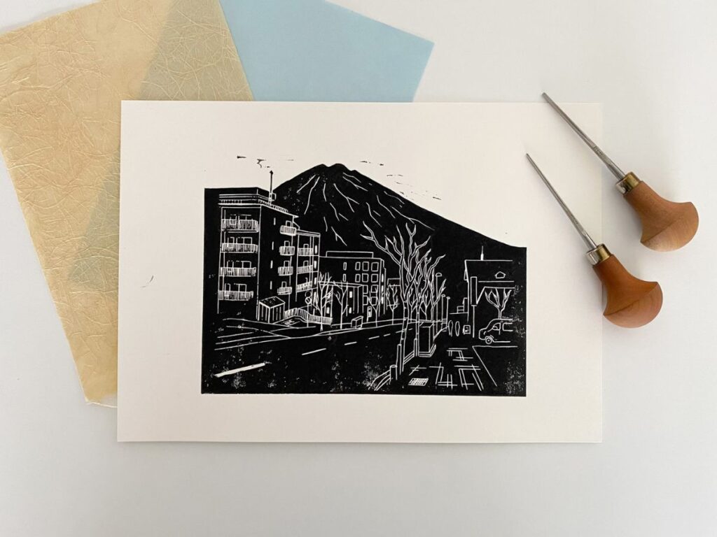 This lino print is looking down Hirafuzaka (the main hill leading to the Grand Hirafu Ski Resort) towards Mt Yotei.